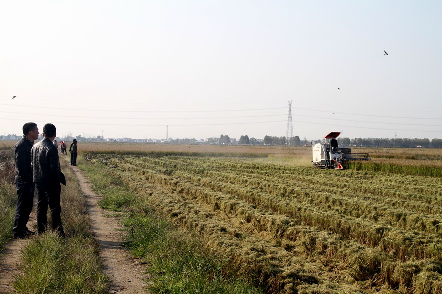111日下午,連陰后地放睛氣溫明顯回升,鹽田稻花香,稻谷歸曬場,銷售訂單忙。在青口公司大新農場的一分場趙斯凱的條田,兩臺收割機來回穿梭,一片繁忙的景象,全公司近二萬畝水稻開始收割。