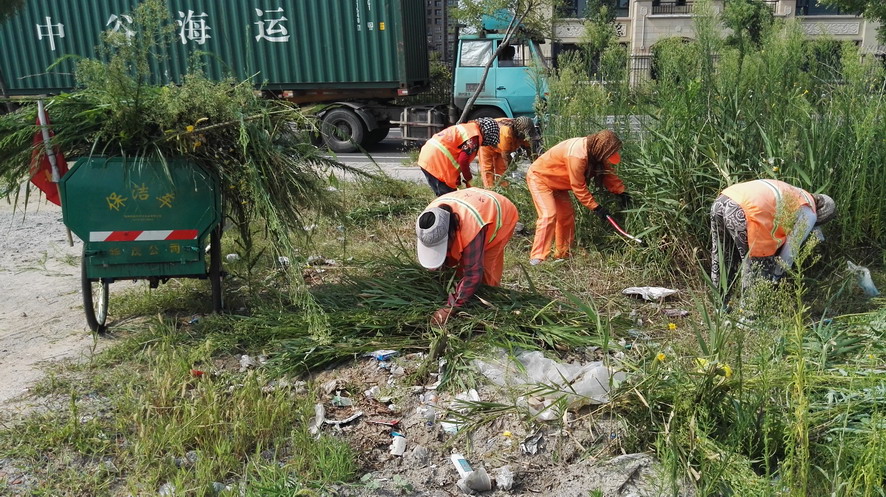 在昌圩湖環湖路南側一處公共廁所處,裕升養護公司20多名環衛保潔工人正在清理公廁周邊的雜草、建筑垃圾,有的在割草、有的在搬磚、有的在推車,一個個汗流浹背,忙得不亦樂乎。正在現場忙碌的保潔大隊長劉保軍對筆者說:“這一塊段還沒有交給我們養護,一直無人管理,雜草叢生,成為建筑、裝修垃圾的堆放地,根據開發區創衛環境衛生無死角要求和華茂公司生產技術部門指令,我們裕升養護公司承擔這一區域環境衛生突擊整治任務,從綠化保潔班組抽調20多人來搞突擊,大家面對天氣炎熱、工作量大、清理困難等因素,發揚不怕吃苦、敢打硬仗的華茂精神,奮戰在突擊現場,每個人都汗流不止,工作服全被汗水浸透,昨天我們已在這里整整干了一天,由于垃圾量大、雜草面積大,我們動用了裝載機等機械設備,運雜草的三輪車跑近百趟,清理建筑、裝修等垃圾數十噸。估計今天下午能夠全部結束。”