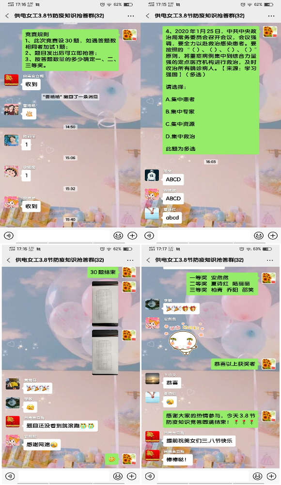 值此2020年第110個國際“三八”婦女節來臨之際,為了讓公司女職工在做好自身疫情防護的前提下,能夠度過一個健康、愉快、充實的節日,公司女工委利用微信群組織全體女職工開展了慶“三八”抗新冠疫情防護知識搶答賽活動。