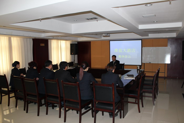 11月21日上午,淮鹽大酒店組織領班以上領導干部,再次集體學習酒店管理方面的知識。
