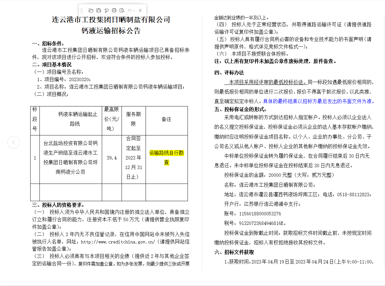 連云港市工投集團日曬制鹽有限公司鈣液運輸招標公告