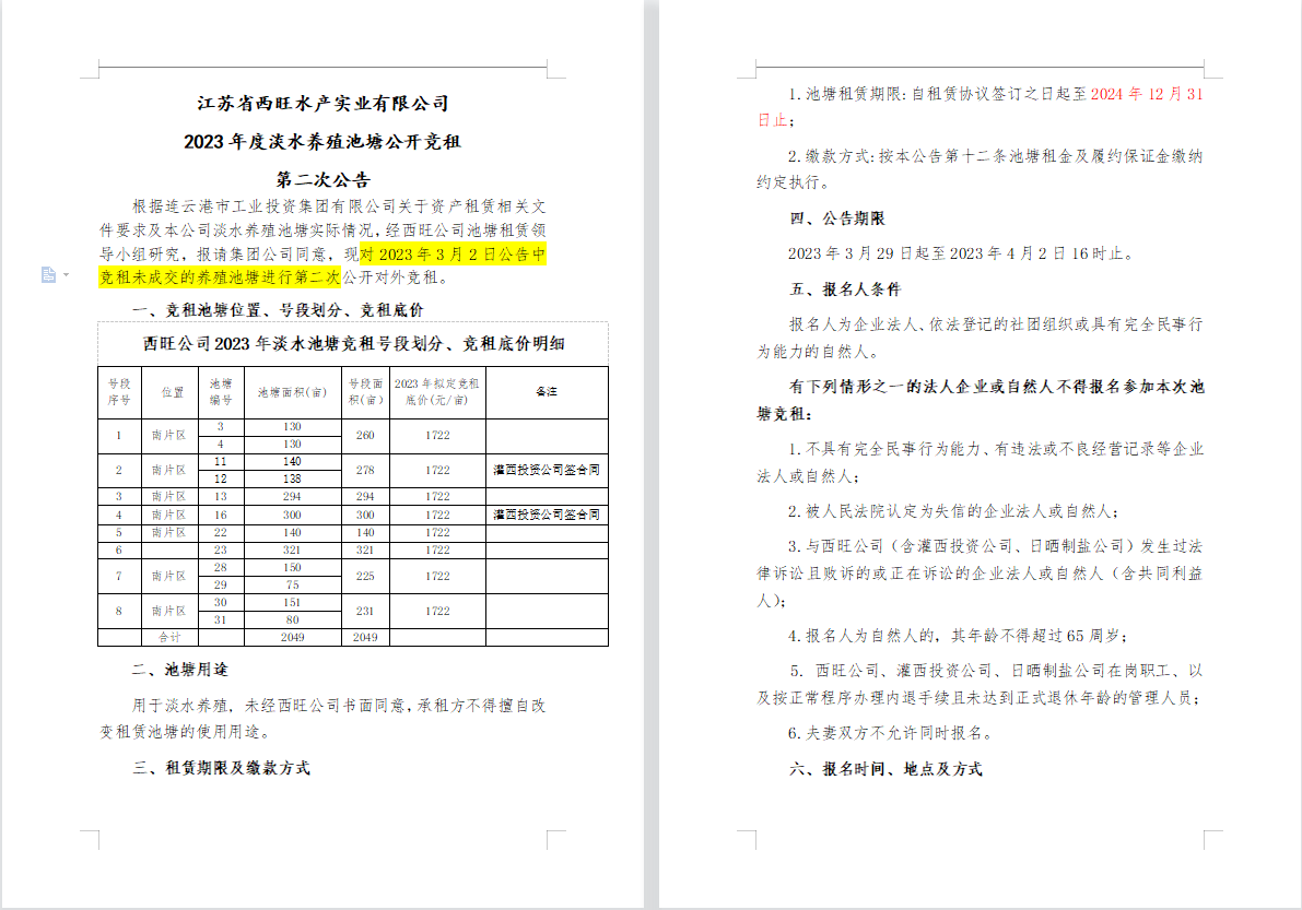 江蘇省西旺水產(chǎn)實業(yè)有限公司2023年度淡水養(yǎng)殖池塘公開競租第二次公告