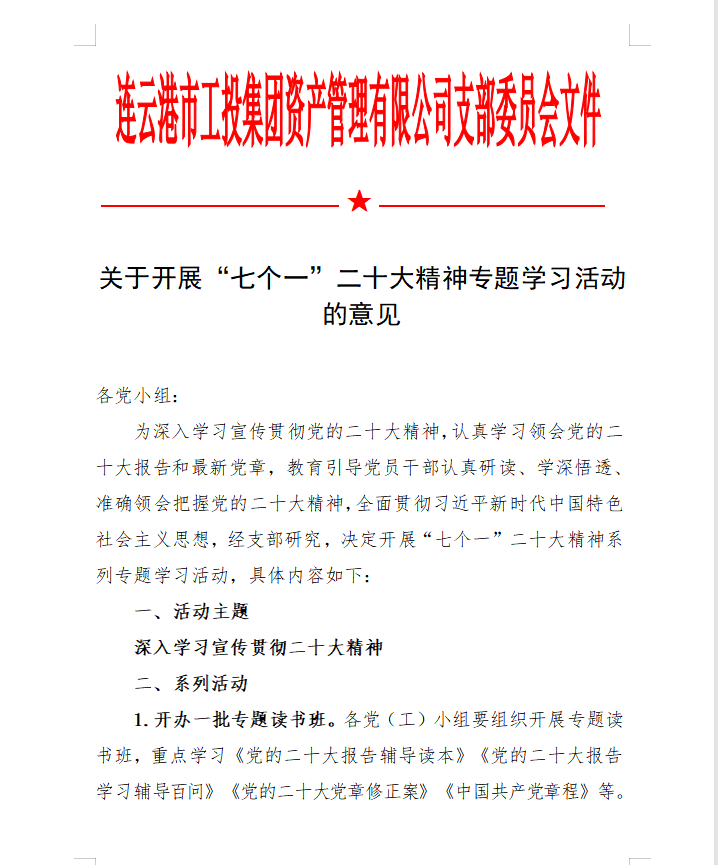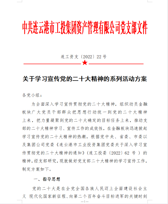 為在金融板塊快速掀起學(xué)習(xí)宣貫黨的二十大精神熱潮,支部精心組織、積極籌劃,完善學(xué)習(xí)方案,創(chuàng)新學(xué)習(xí)教育形式,豐富黨建活動(dòng)載體,支部結(jié)合公司實(shí)際,專(zhuān)門(mén)制定《學(xué)習(xí)宣傳貫徹二十大精神學(xué)習(xí)方案》、《關(guān)于開(kāi)展“七個(gè)一”二十大精神專(zhuān)題學(xué)習(xí)活動(dòng)的意見(jiàn)》。