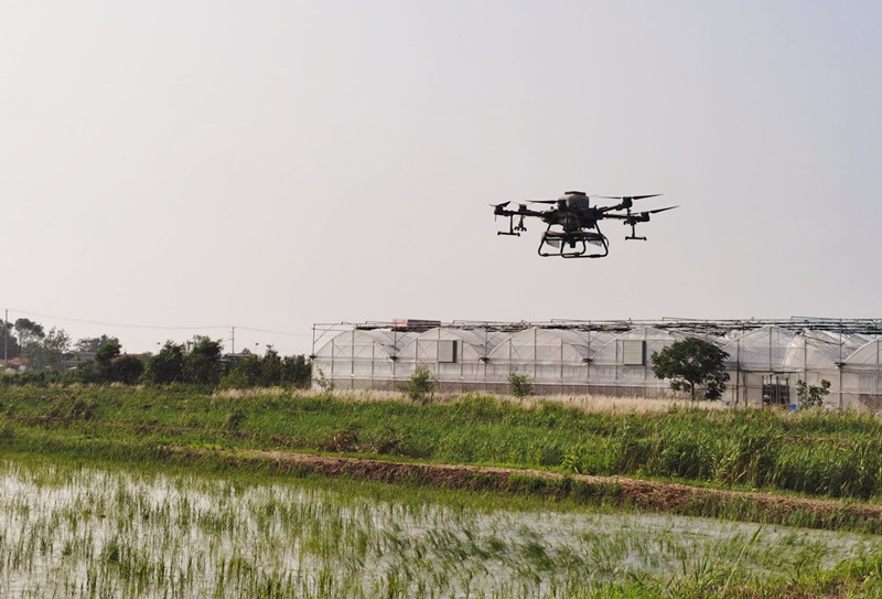 夏至水門開,接連幾天的暴風雨,田間道路泥濘。6月28日下午,天氣剛剛轉晴,倉儲中心抓住有利天時,緊爭農務,搶抓農時節點,采用無人機為水稻田有序開展追肥工作。(姜姝妍)
