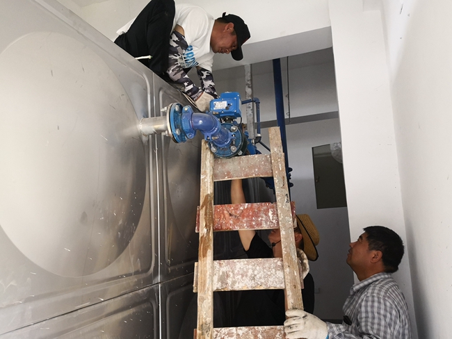 搶修現場,工作人員經過仔細勘察,并通過自動供水配電柜的各項數據逐一排查,最終確定為進水水力閥銹蝕損壞,失去水箱滿水時自動停水的功能,造成水箱溢水現象發生。由于泵房內維修空間狹小,操作有一定難度,為了保證居民生活用水不受影響,自來水班組 想方設法,一方面安排專職人員現場監督安全,另一方面,安排熟練的操作工 在狹小的空間里半蹲著操作維修,甚至 還要進入水箱內更換配件,拆除壞閥門、連接管道、加裝防漏水皮墊、擰緊螺絲等多道工序順利完成 。經過近 3小時的奮力苦干,終于搶修完畢,恢復正常供水,有力的保證了小區居民的生活用水。 (張根玲)