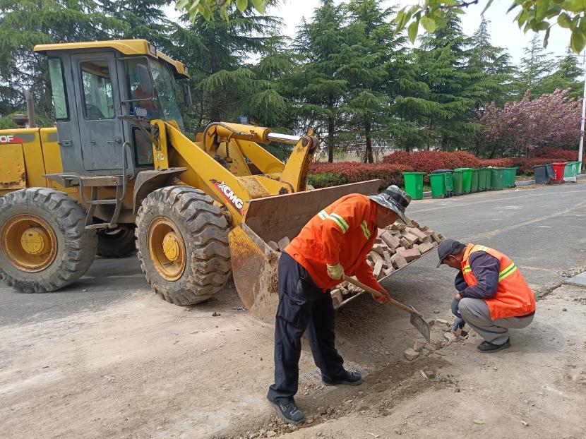 項目開工前,盛達市政分公司召開中科院提升改造專項會議,根據各單項工程落實安全生產責任制,分班組劃片區,并對隱蔽工程、交叉作業項目制定專項施工方案。該項目工期僅 30 天,由于工期緊,任務重,施工人員正在開足馬力搶時間、趕進度,在項目施工現場,原道磚清除、舊電纜拆除、新建道路基礎墊層、路牙石鋪設等各施工任務同步開展,挖掘機、裝載機、貨車等各種工程車輛有序穿梭,各施工現場圍擋、指示牌、路錐等擺放規范,人員工作服、安全帽等穿戴整齊,確保安全文明施工。