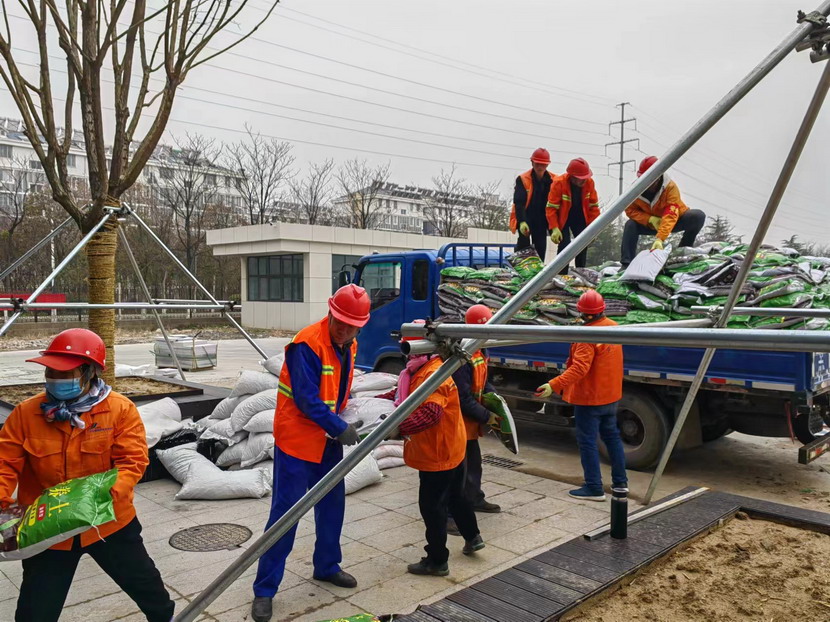 納福花境面積為126㎡,施工周期27日至31日,共5天。此次栽植前工作不同于以往,要先在底部鋪設排水板、土工布及2cm厚陶粒墊層,保證花箱底部透氣性及在降雨時能及時排出積水,再鋪設25cm厚黑泥土加20cm厚營養土拌5%沙,滿足植物的生長需要,完成栽植后在土壤上層鋪設2cm厚麥飯石。