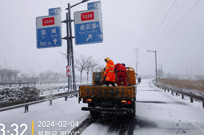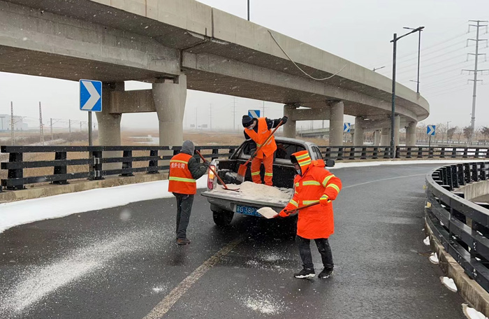 掃雪除冰工作刻不容緩。按照悅升公司掃雪除冰工作任務分配,環衛分公司負責228徐新路到環保大道路段掃雪除冰任務。該區域內因含有張圩互通大橋,光橋梁匝道、輔道就有8條,上下路段非常陡滑,給掃雪除冰工作帶來極大挑戰。但該公司人員堅決認領任務,沒有任何退縮。他們采取車輛緩慢行駛方式,橋梁陡峭路段就使用人工用鐵锨一锨一锨端灑的方式進行。雖然寒風雪天中,不停的作業使胳膊潑灑的極其酸累,但大家不辭辛苦,沒有一絲怨言,全體人員全部值守在崗,奮戰在掃雪除兵工作第一線,僅24日一天,就潑灑融雪劑7車近30噸,為打贏掃雪除冰功堅戰打好堅實基礎。(晁華)